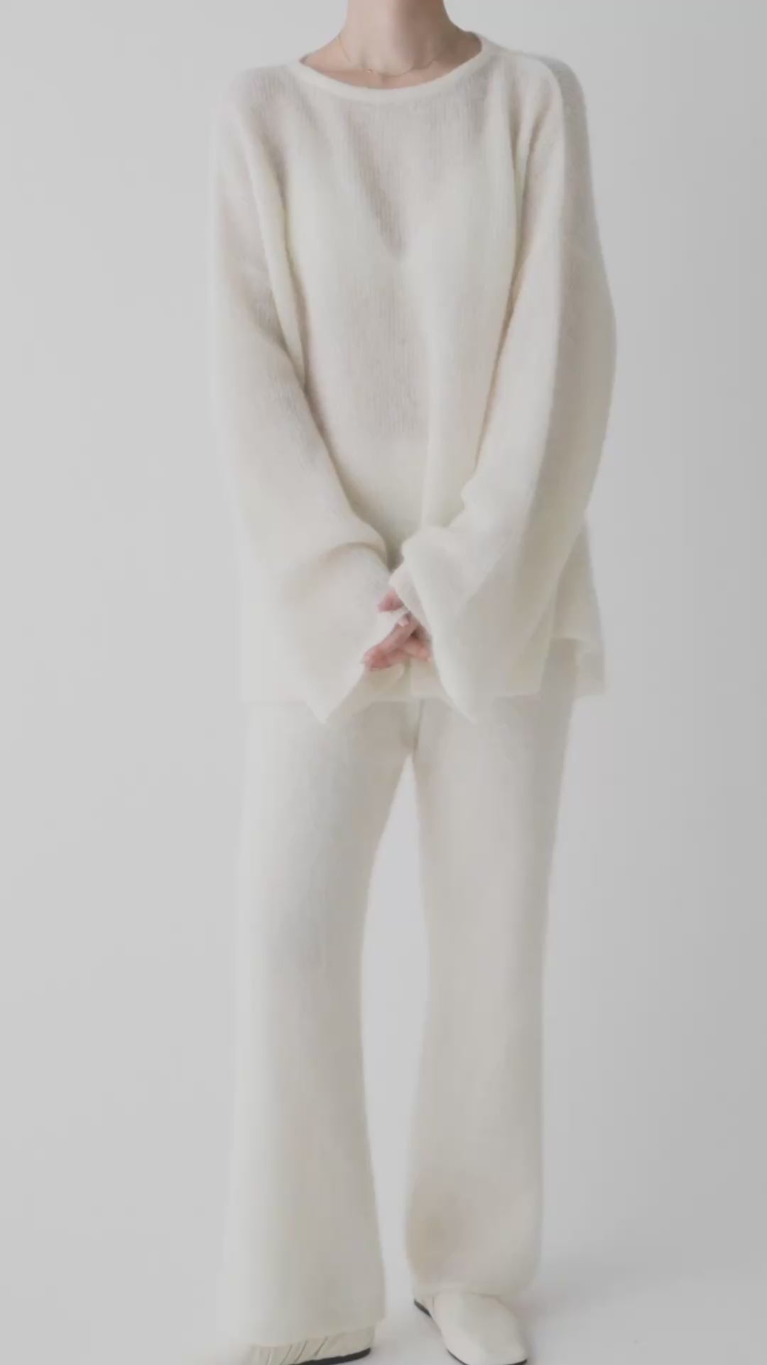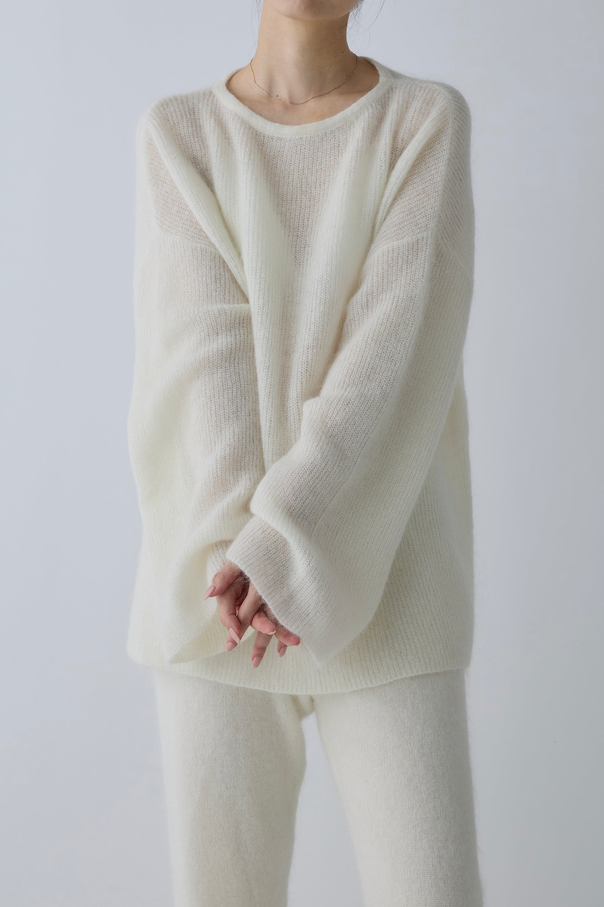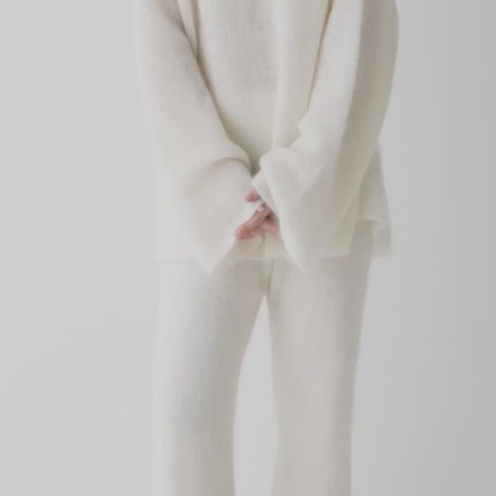 柔らかなモヘア高混率の糸を、甘く柔らかく編み立てたニットパンツ。