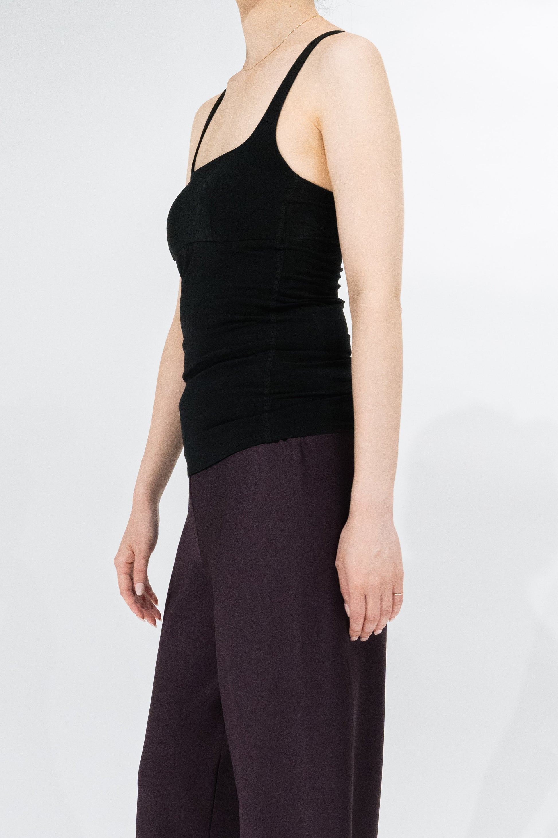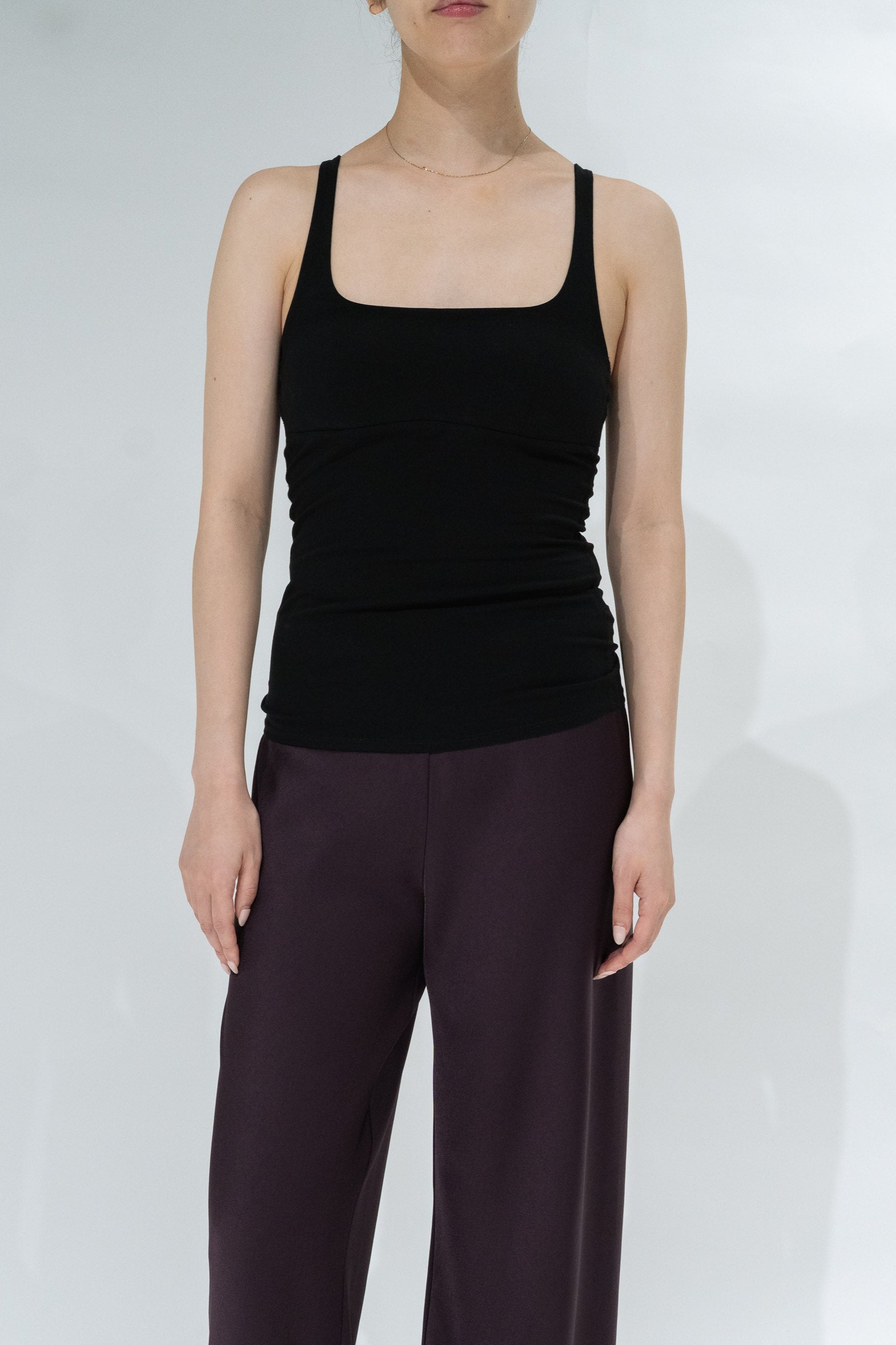スクエアネックのデザインがデコルテを美しく引き立て、